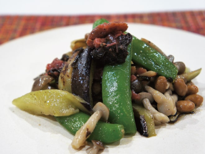 スナップえんどうと茄子の梅塩昆布納豆ソテー