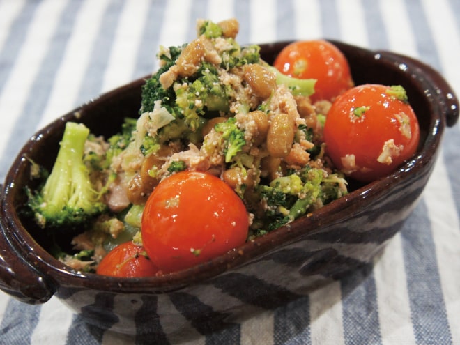 納豆(丹念納豆)、ブロッコリー、プチトマト、ニンニク、明太子、ツナ、塩、粗びき塩コショウ、オリーブオイル