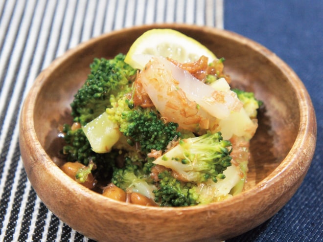 納豆(丹念納豆)、やりいか、ブロッコリー、鰹節、醤油、レモン、塩