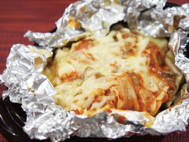 ③キムチ、マヨネーズ、納豆、チーズを順番にのせたらアルミを閉じて、魚焼きグリルで蒸し焼きにしたら完成です。