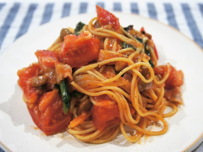 トマトとほうれん草の納豆チーズナポリタンの作り方