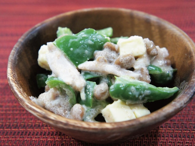 納豆(丹念納豆)、ピーマン、サラダチキン、プロセスチーズ、明太子、シーザーサラダドレッシング