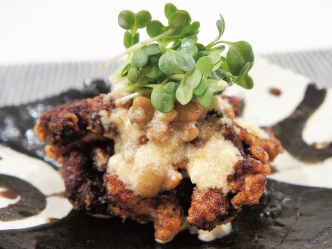 ④器にから揚げを盛りつけて、納豆と先程の③のソースをかけ、かいわれを添えたら完成です。