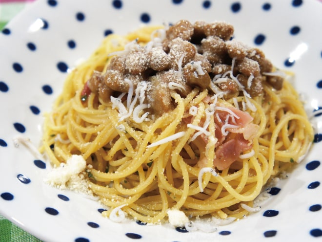 じゃこと梅とピーマンの和風納豆パスタ