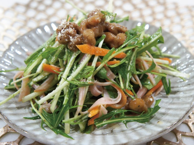 水菜とにんじんの納豆サラダ 材料納豆(丹念納豆)、水菜、にんじん、ハム、酢、砂糖、醤油、ごま油、粗びき塩コショウ、粉チーズ水菜とにんじんの納豆サラダの作り方①水菜は食べやすい長さにカットします。②にんじんは皮を剥いて、ハム同様千切りにカットしておきます。③ボールに、①と②を入れて混ぜ合わせます。④別なボールに、酢、砂糖、醤油、ごま油、粗びき塩コショウを入れてよく混ぜ合わせます。⑤納豆を加えたら④のドレッシングをかけてよく和え、器に盛り付けて粉チーズを振りかけ完成です。