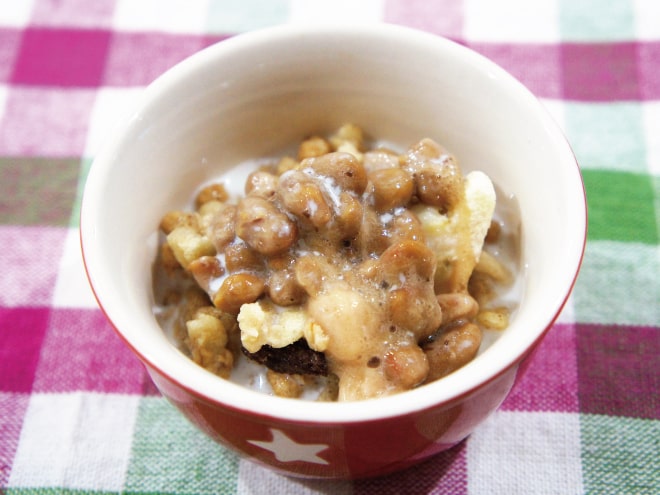 納豆(丹念納豆)、フルーツグラノーラ、牛乳