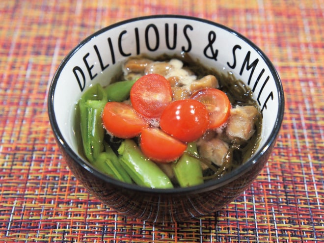 ②器に、もずく酢を入れてスナップえんどう、カットしたプチトマトを入れます。