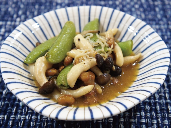 納豆(丹念納豆)、スナップえんどう、しめじ、ちりめんじゃこ、バター、醤油、粗びき塩コショウ、塩