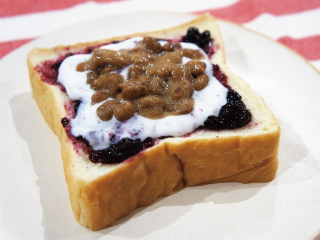 納豆(丹念納豆)、食パン、ブルーベリージャム、ヨーグルト
