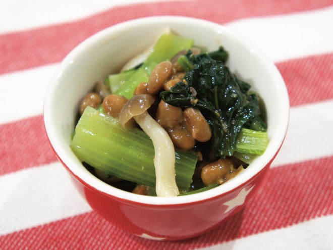 ④ボールに、小松菜としめじを移したら、納豆、麺つゆ、ごま油、塩、白すりごまを加え味を調えて、器に盛り付けたら完成です。