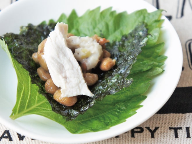 ③紫蘇に、韓国海苔、納豆、鶏胸肉、ねぎ塩チューブ、レモン絞り汁をかけたら巻いてお召し上がり下さい。