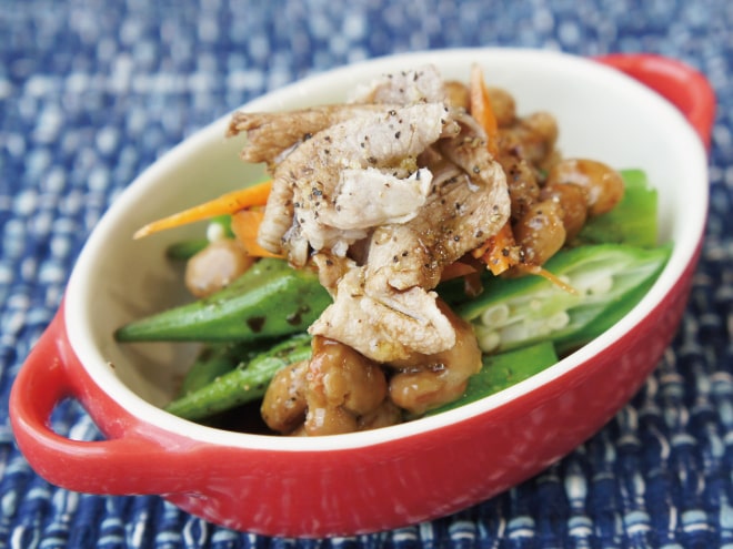 ③オクラの上に千切りにしたにんじんと納豆、豚肉をのせたら、バルサミコ酢、粗びき塩こしょう、オリーブオイルをかけて完成です。
