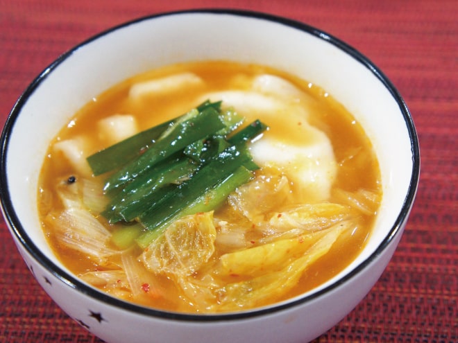 ①鍋に、水を入れて沸騰させたら、斜めにカットした白ネギ、キムチの漬物、ウェイパー、キムチの素、甜麺醤を入れて味を調えます。
