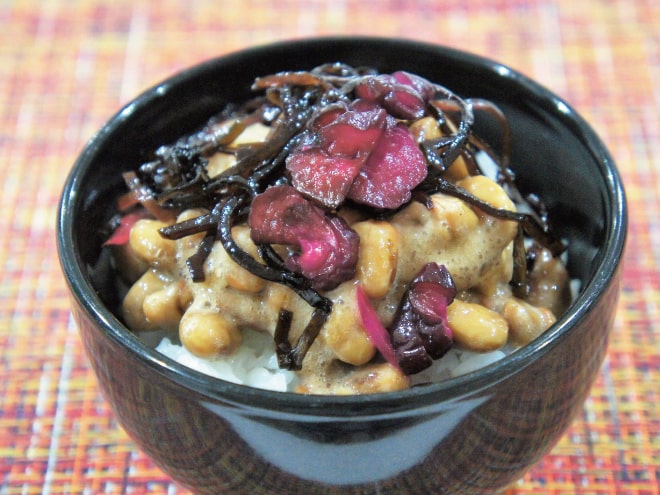 ②よく混ぜた丹念納豆と昆布としば漬けをのせたら完成です。