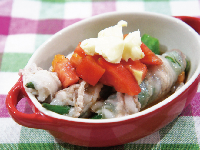納豆(丹念納豆)、豚ロース薄切り肉、オクラ、トマト、チーズ、バルサミコ酢、オリーブオイル、粗びき塩こしょう