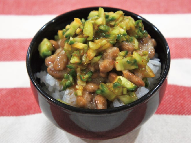 ④器にご飯を盛りつけて、納豆とキムチゴーヤをのせたら完成です。