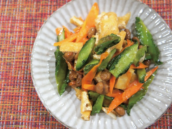 納豆(丹念納豆)、四角豆、にんじん、薄揚げ、塩レモンタレ、粗挽き塩こしょう、醤油、にんにく