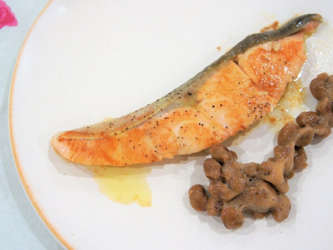 ③鮭を器に盛りつけて、フライパンに残っているソースをかけ、丹念納豆を添えたら完成です。