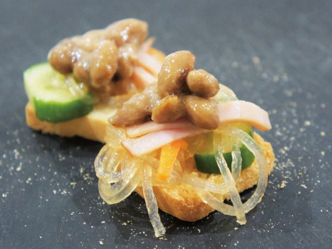 納豆(丹念納豆)、ミニラスク、春雨、にんじん、きゅうり、ハム、ポン酢、砂糖、ごま油