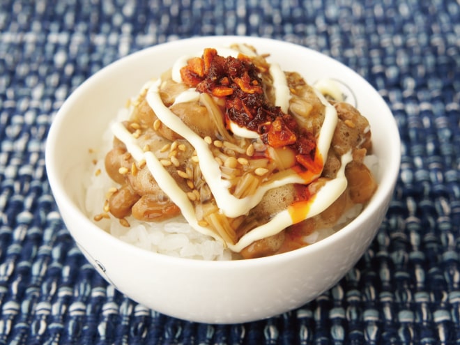納豆(丹念納豆)、食べるラー油、なめ茸、ごま、マヨネーズ、ご飯