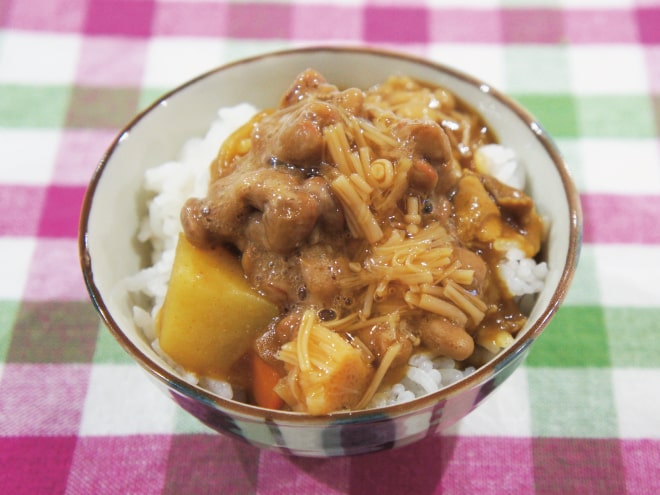 納豆(丹念納豆)、薄切り豚肉、薄切り牛肉、じゃがいも、にんじん、玉ねぎ、カレールー、なめ茸、白米