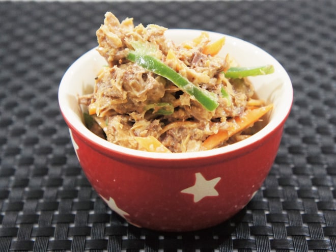 納豆(丹念納豆)、鯖缶、ピーマン、にんじん、マヨネーズ、粗挽き塩こしょう