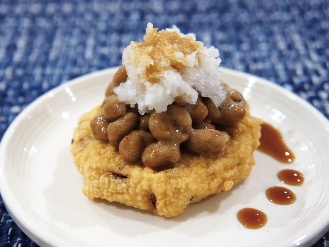 ④器に、揚げた芋をのせて、大根おろし、納豆、ポン酢をかけたら完成です。