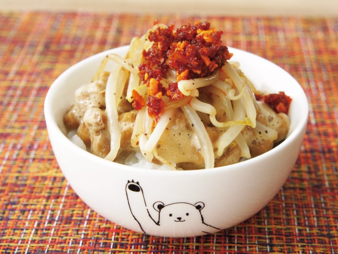 ④器にご飯を盛りつけたら、納豆、③のもやし炒め、食べるラー油をかけて完成です。