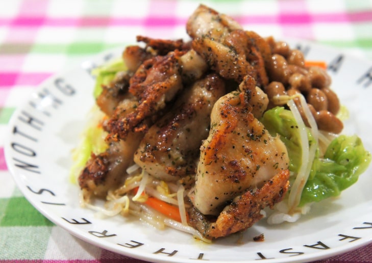 ⑤器に、ご飯を盛りつけたら炒めた野菜、チキン、丹念納豆をかけて完成です。