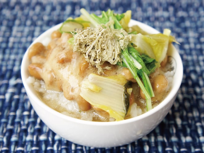納豆(丹念納豆)、白菜、水菜、だし醤油、醤油、白米、とろろ昆布
