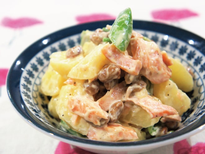 納豆(丹念納豆)、塩鮭、じゃがいも、スナップえんどう、マヨネーズ、粉チーズ、粗挽き塩こしょう、塩