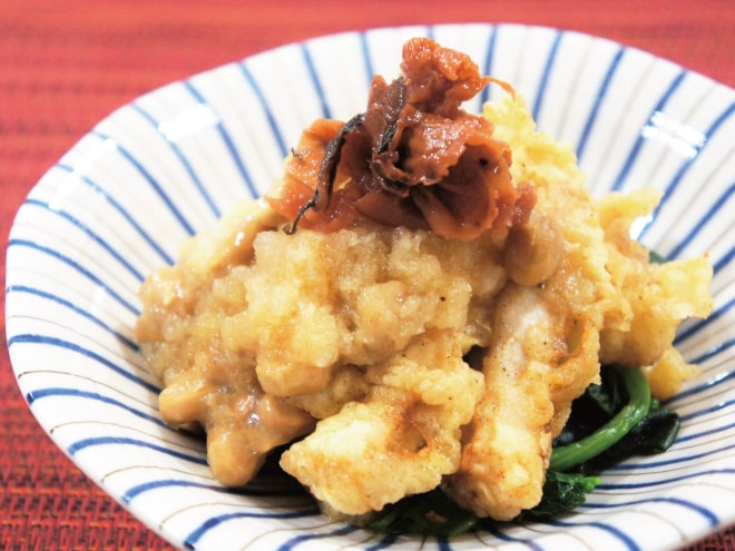 ⑤器にほうれん草と鶏天を盛りつけて、大根おろし、納豆、ポン酢、麺つゆを混ぜたタレをかけ、種なし梅をのせたら完成です。