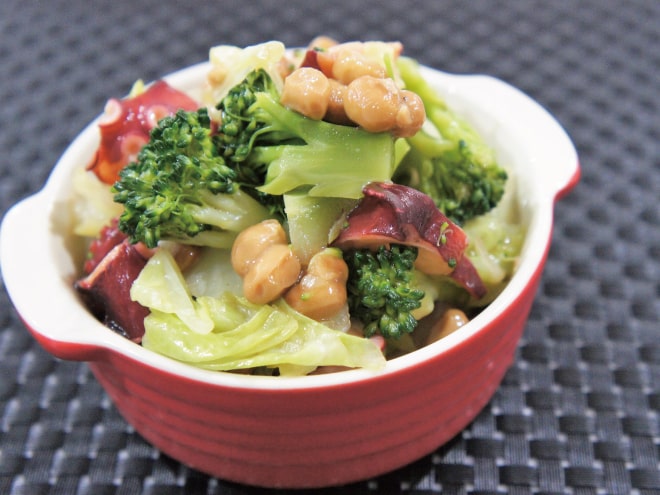 納豆(丹念納豆)、キャベツ、ブロッコリー、タコ、バルサミコ酢、醤油、オリーブオイル、粗挽き塩こしょう、ニンニクチューブ