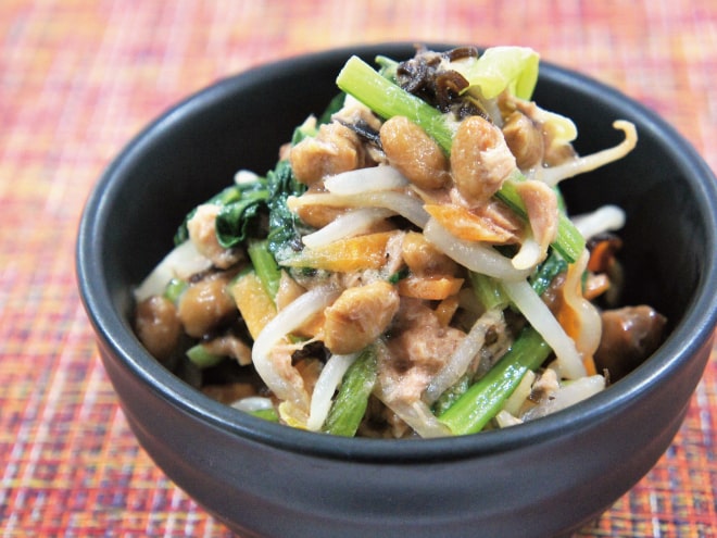 納豆(丹念納豆)、もやし、小松菜、にんじん、シーチキン、マヨネーズ、ごま油、薄口醤油、塩昆布、ニンニクチューブ