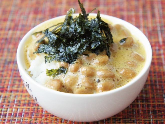 ②お茶碗についだご飯に卵納豆をかけたら、韓国のりを散らして完成です。