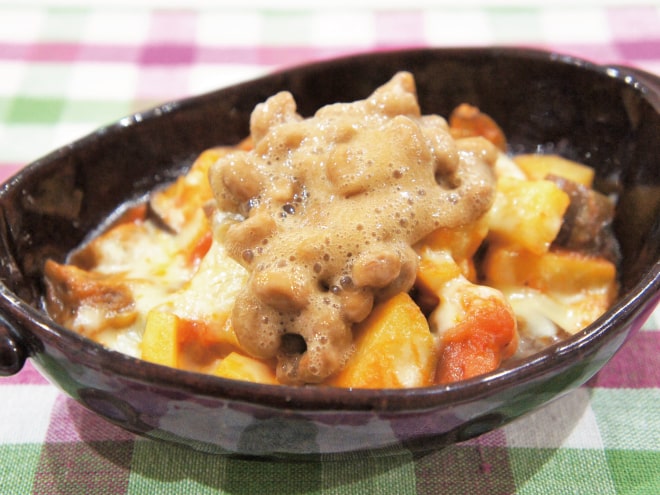 茄子とじゃがいもの納豆トマトチーズ焼き