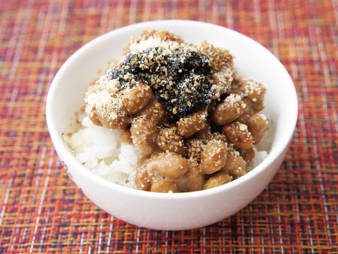 納豆(丹念納豆)、海苔の佃煮、すりごま、粉チーズ、ご飯