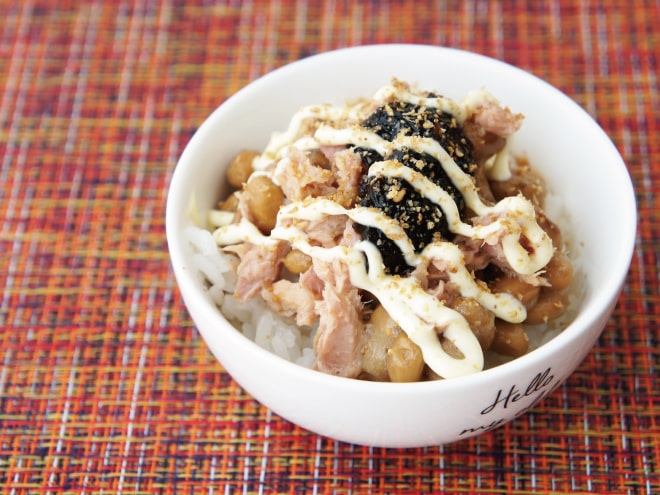 納豆(丹念納豆)、海苔の佃煮、シーチキン、マヨネーズ、すりごま、ご飯