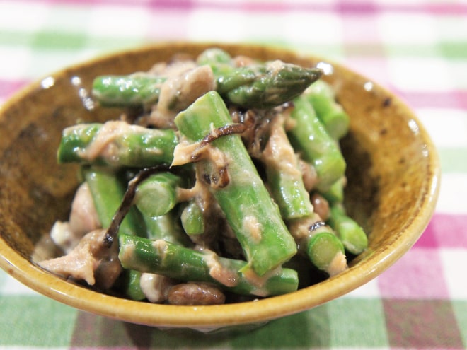 アスパラと塩昆布のマヨツナサラダ|納豆を使用した簡単料理、レシピ・作り方を紹介