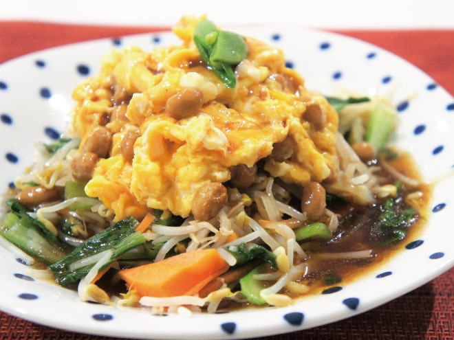 納豆(丹念納豆)、もやし、にんじん、小松菜、卵、醤油、酒、中華あじ、砂糖、片栗粉、ごま油、粗挽き塩コショウ