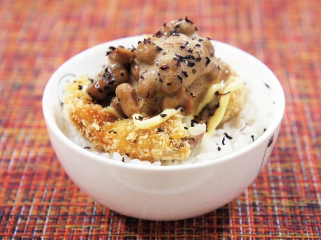 ⑤器にご飯を盛り付け、コロッケをのせたら真ん中を軽く潰し、納豆とゆかり、マヨネーズをかけたら完成です。