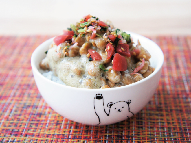 ③器にご飯を盛り付けて、良く混ぜた納豆と②をかけたら完成です。