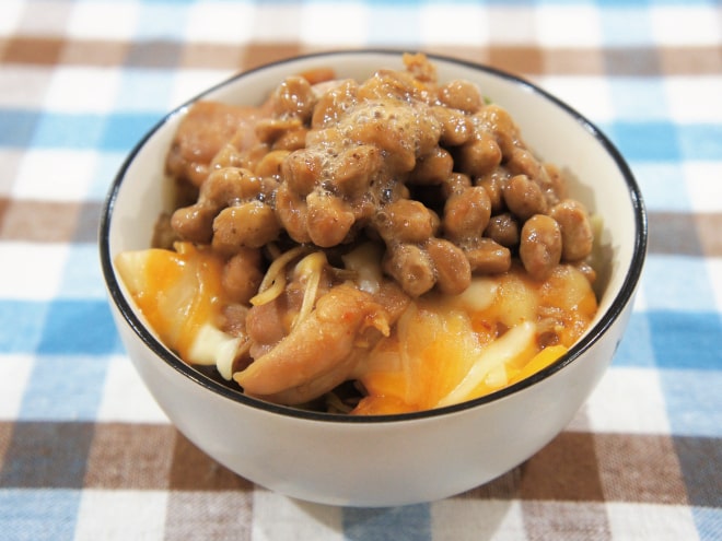 納豆(丹念納豆)、もやし、鶏もも肉、コチュジャン、醤油、砂糖、酒、ニンニクチューブ、ピザ用チーズ、白米