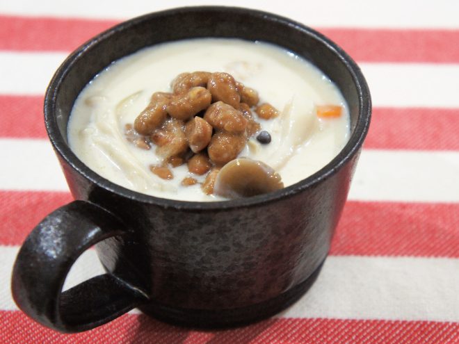 納豆(丹念納豆)、玉ねぎ、じゃがいも、にんじん、しめじ、鶏もも肉、豆乳、マギーブイヨン、塩コショウ