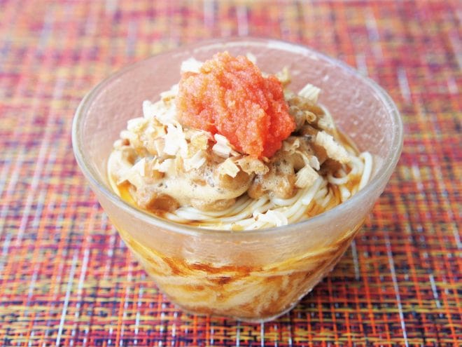 ②麺つゆをかけて、よく混ぜた納豆、かつおぶし、明太子をのせて完成です。