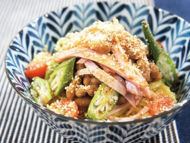 納豆(丹念納豆)、ハム、オクラ、プチトマト、冷やし中華めん、擦り胡麻、粉チーズ