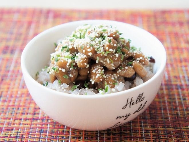 ③納豆、粉チーズ、青のりをかけたら完成です。