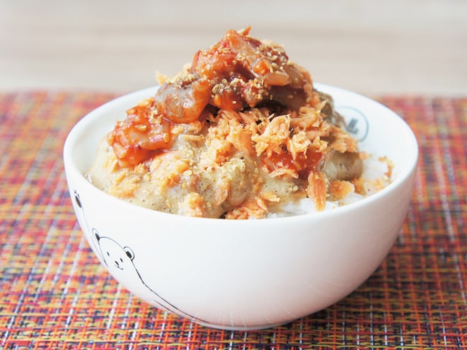 シャケたこキムチ納豆ご飯の作り方