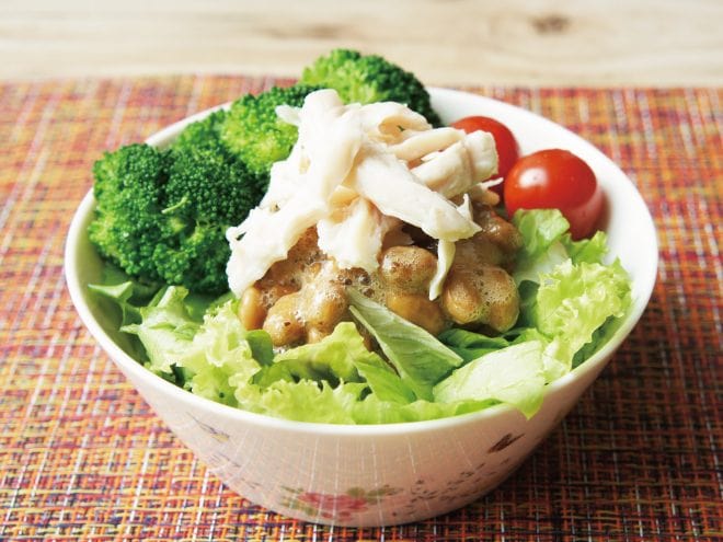 ③最後に、納豆と割いた鶏肉をのせて、お好みのドレッシングをかけたら完成です。