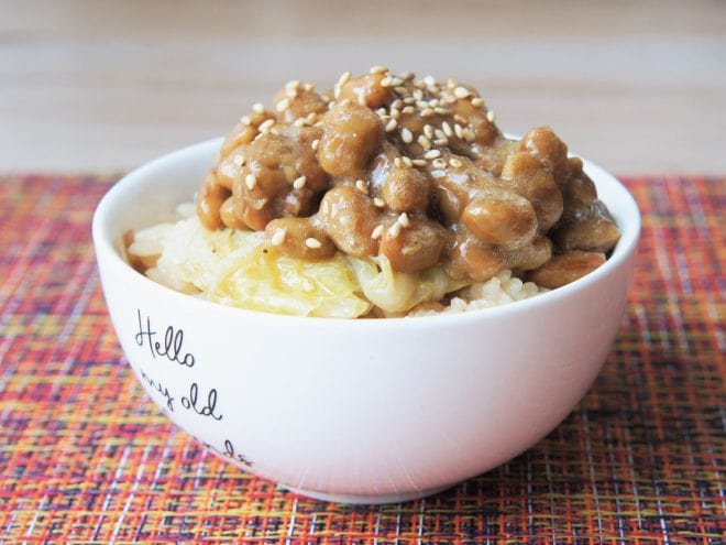 ④器に炊き込みご飯を盛り付けて、納豆と③の蒸し白菜、胡麻をかけたら完成です。